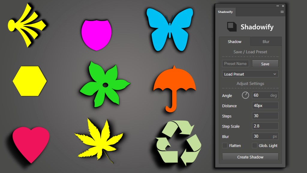 Dropshadows in Photoshop often look unrealistic – Shadowify allows you to create more natural shadows by applying stepwise blur. You can create customizable dropshadows from scratch with a click or blur existing shadows. All settings are customizable, so you can also turn off blur and create some flat shadows like often used in minimalistic design. The direction can even be adjusted afterwards via global light. You can save your favourite shadow and blur settings as presets for later use.